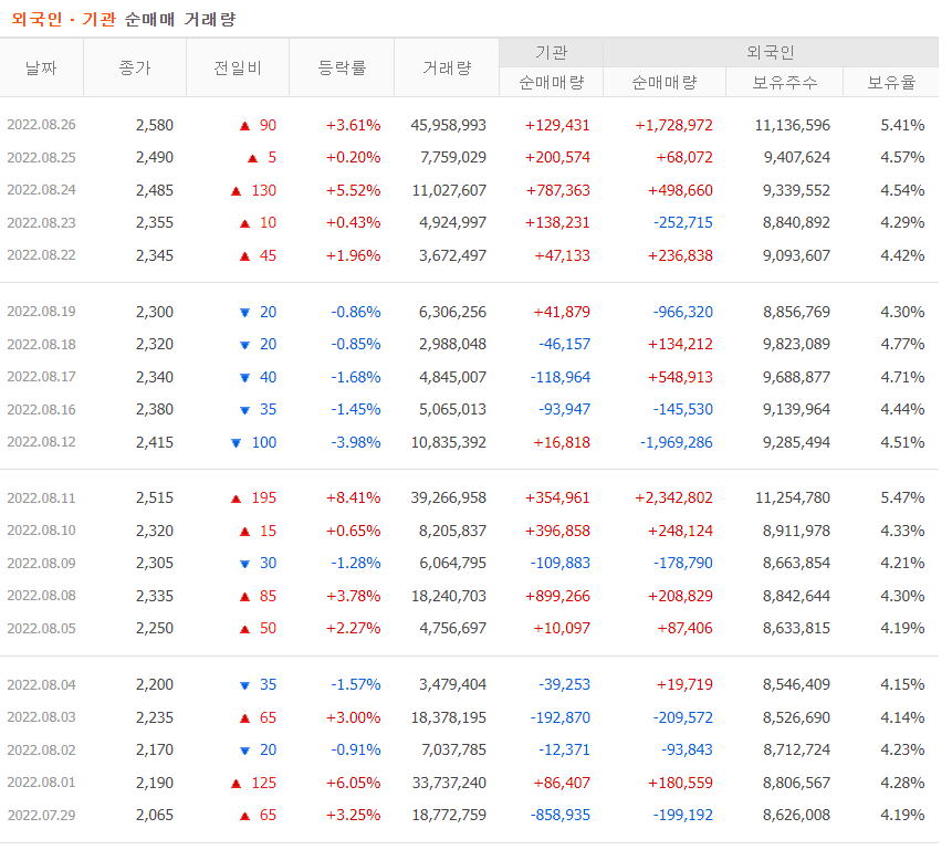 꾸준한 기관 또는 외국인 혹은 두 매수주체의 꾸준한 또는 큰 매수량을 동반한다.